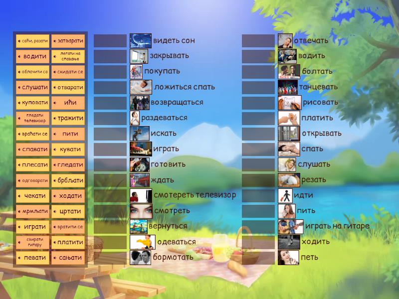 цртати - рисовать, кувати - готовить, сећи, резати - резать, водити - водить, ходати - ходить, пити - пить, затварати - закрывать, куповати - покупать, платити - платить, певати - петь, слушати - слушать, свирати гитару - играть на гитаре, гледати - смотреть, чекати - ждать, играти - играть, тражити - искать, ићи - идти, отварати - открывать, гледати телевизор - смотереть телевизор, скидати се - раздеваться, легати на спавање - ложиться спать, плесати - танцевать, враћати се - возвращаться, спавати - спать, сањати - видеть сон, вратити се - вернуться, облачити се - одеваться, брбљати - болтать, мрмљати - бормотать, одговарати - отвечать,