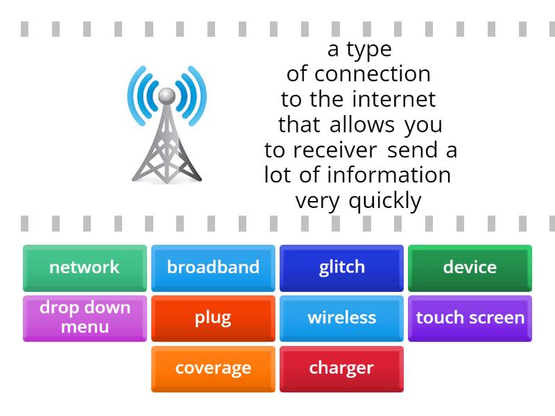 broadband - a type of connection to the internet that allows you to receiver send a lot of information very quickly, charger - a piece of equipment used for giving power to a battery, coverage - the strength of the signal to your phone from your network, device - a machine or piece of equipment that does a particular thing, drop down menu - a list of options that appears on a screen when you press it, glitch - a small and sudden problem especially with technology, network - when a set of similar things are connected to each other (computers or phones), plug - an object used to connect a piece of equipment to an electricity supply, touch screen - a screen on a computer, tablet or phone that you touch in order to choose what you want to do next, wireless - this technology communicates using electronic signals, not using wires,