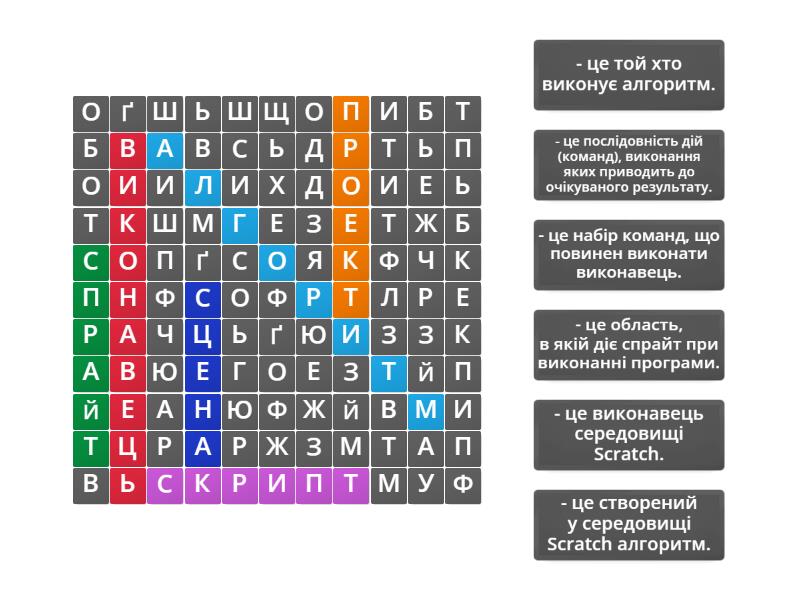 Знайдіть слова до теми "Алгоритми і виконавці. Scratch". Дайте їм визначення.