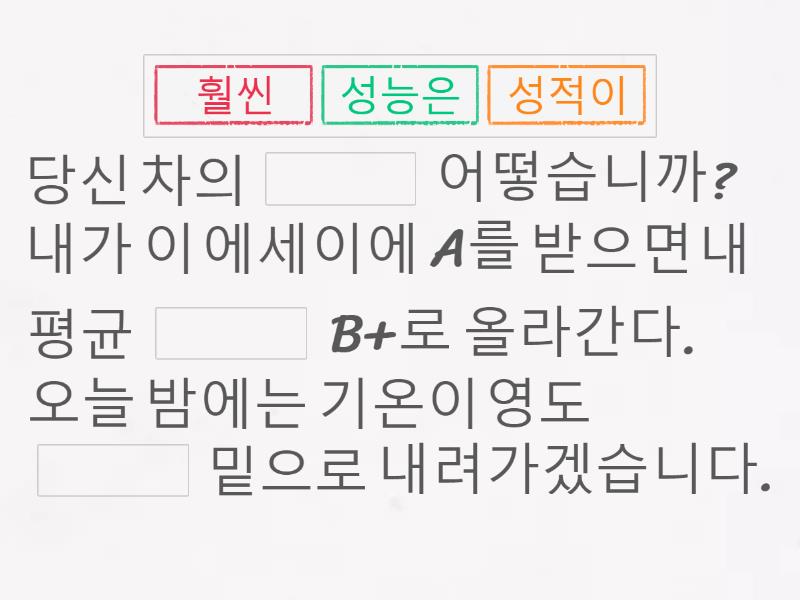 당신 차의 ____ 어떻습니까? 내가 이 에세이에 A를 받으면 내 평균 ____ B+로 올라간다. 오늘 밤에는 기온이 영도 ____ 밑으로 내려가겠습니다. 티켓 교환 및 ____ 환불 불가. 이 양초들은 색상과 향기가 ____. 새 방은 ____ 들어? 그 구두는 ____ 진짜 귀요워요. 지난 주에 헤어졌던 데이브와 클라라가 오늘부터 다시 사귀기로 했어. 그들의 관계는 정말 ____. 그 텔레비전 영화는 ____ 소설에서 각색되었다. ____ 중요합니다. 커피와 차 ____ 다음 통로에 있습니다.