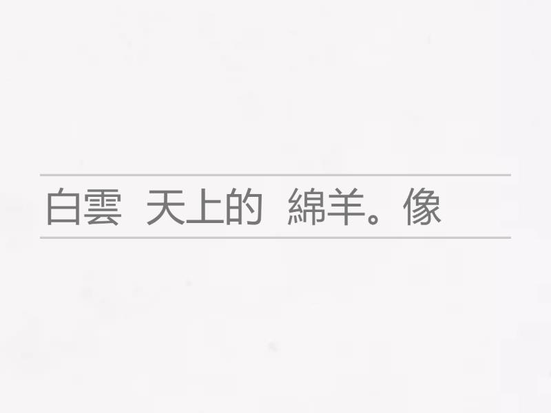 天上的 白雲 像 綿羊。, 這個 西瓜 像 一個 大皮球。, 天上的 彩虹 像 一座 橋。, 晚上 天空的 星星 像 閃亮的 眼睛。, 天空 中的 飛機 像 一隻 大鳥。, 河裏的 小船 像 一片 樹葉。, 彎彎的 月亮 像 一根 香蕉。, 樹林裏的 大樹 像 一把 大雨傘。, 大象 長長的 鼻子 像 一條 水管。, 長長的 火車 像 一條 蛇。,