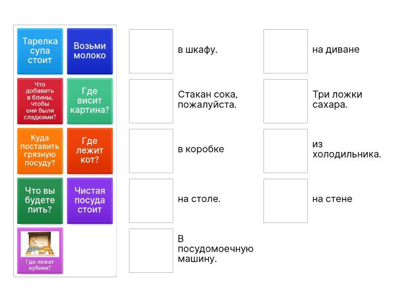Тарелка супа стоит - на столе., Чистая посуда стоит - в шкафу., Возьми молоко - из холодильника., Что вы будете пить? - Стакан сока, пожалуйста., Что добавить в блины, чтобы они были сладкими? - Три ложки сахара., Куда поставить грязную посуду? - В посудомоечную машину., Где висит картина? - на стене, Где лежит кот? - на диване, Где лежат кубики? - в коробке,