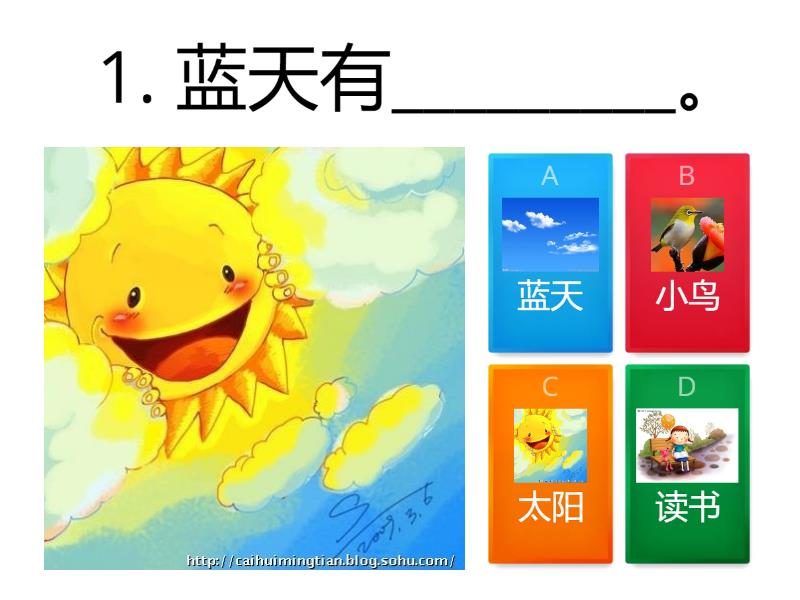 1) 1. 蓝天有_________。 a) 蓝天 b) 小鸟 c) 太阳 d) 读书 2) 1. 蓝天有_________。 a) 蓝天 b) 小鸟 c) 太阳 d) 读书 3) 2. 蓝天有_________。 a) 蓝天 b) 读书 c) 上学 d) 小鸟 4) 2. 蓝天有_________。 a) 蓝天 b) 读书 c) 上学 d) 小鸟 5) 3. 小鸟在________飞 a) 读书 b) 蓝天 c) 小鸟 d) 太阳 6) 3. 小鸟在________飞 a) 读书 b) 蓝天 c) 小鸟 d) 太阳 7) 4. 我在_________。 a) 小鸟 b) 蓝天 c) 太阳 d) 读书 8) 4. 我在_________。 a) 小鸟 b) 蓝天 c) 太阳 d) 读书 9) 5. 我在_________。 a) 写字 b) 读书 c) 小鸟 d) 太阳 10) 5. 我在_________。 a) 写字 b) 读书 c) 小鸟 d) 太阳 11) 6. 我去________。 a) 蓝天 b) 小鸟 c) 写字 d) 上学 12) 6. 我去________。 a) 蓝天 b) 小鸟 c) 写字 d) 上学
