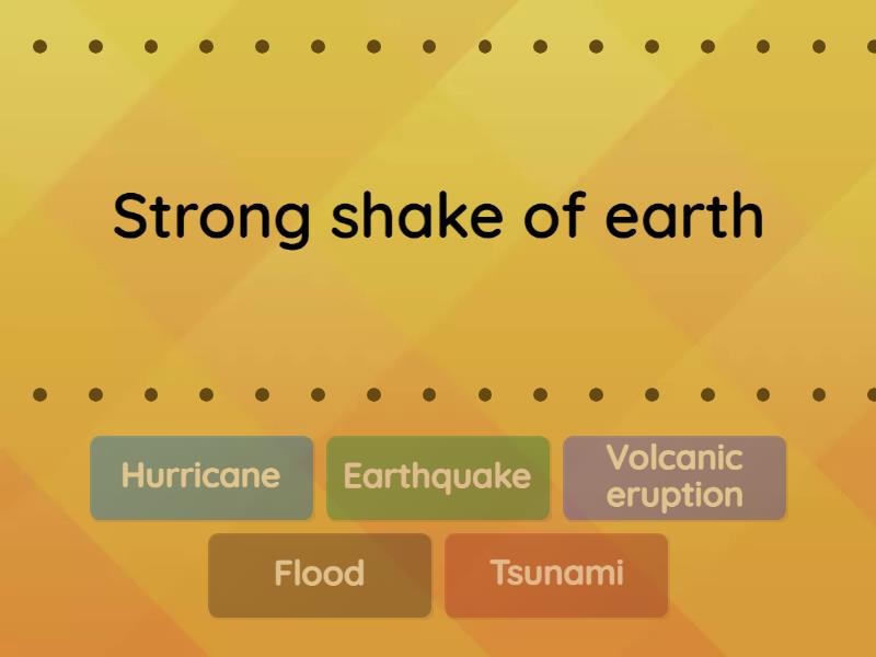 Earthquake - Strong shake of earth , Volcanic eruption - When lava and gas erupt from a volcano, Tsunami - Huge wave caused by an earthquake under the sea, Hurricane - Huge storm that starts over warm sea, Flood - When a place is submerged in water because of heavy rain or overflowing river.,