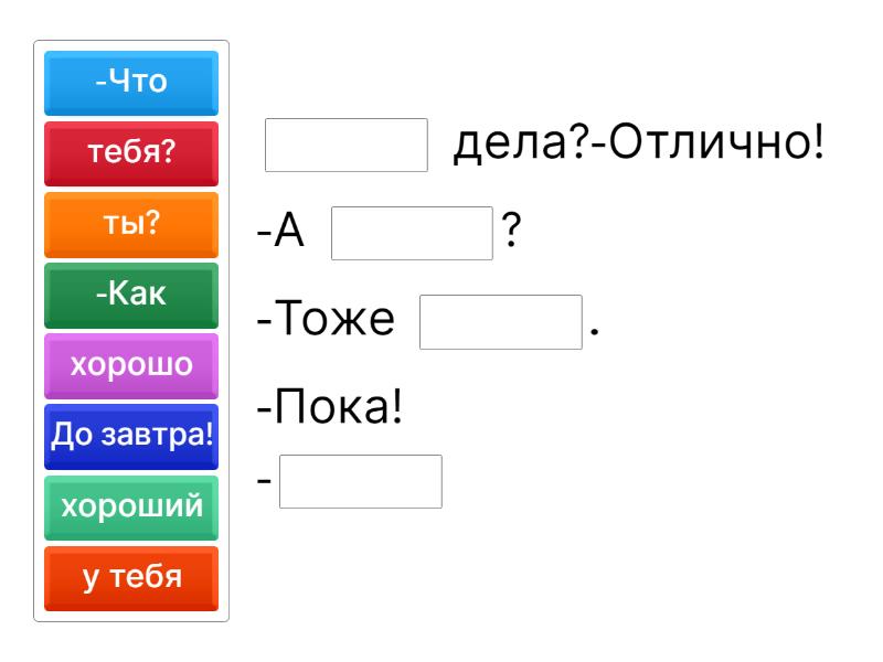 ____ дела?-Отлично! -А ____? -Тоже ____. -Пока! -____ ____ ты идёшь?-Я ____ на дискотеку. ____ куда? -Я в кино. До свидания, я ____. -До свидания. ____ хорошего вечера! - ____ тебе!