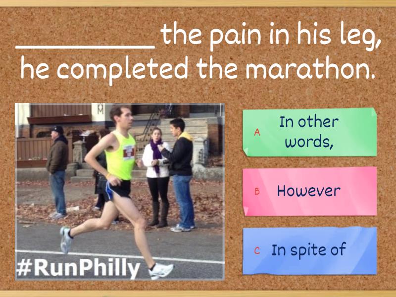 1) _________ the pain in his leg, he completed the marathon. a) In other words, b) However c) In spite of 2) I enjoyed the party, _________ I would have liked more games. a) that's because b) although c) moreover, 3) _________ we saw each other every day, we didn't really know each other. a) Although b) As I see it c) Nevertheless 4) He is busy on Thursday. __________ , I don't think he'll go to your party. a) In spite of this, b) In other words c) Nevertheless 5) The decorations were absolutely beautiful and ___________ , the children had made them themselves. a) therefore b) as I see it, c) what's more 6) He enjoys riding horses and, ____________, is good at it. a) nevertheless b) moreover c) therefore 7) London is a very expensive city. __________ , most of the museums are free! a) However b) Moreover c) Although 8) The are a lot of rewarding jobs, _____________, a teacher and a fireman. a) what is more, b) for instance c) therefore 9) I can play quite a few musical instruments, _________ , the flute, the guitar, and the piano. a) for example b) nevertheless c) what I mean is 10) Citrus fruits, __________ oranges and grapefruits, are high in vitamin C. a) such as b) what I mean is c) not only that 11) I am glad that we decided to go away for the weekend. __________ , it would have been nice to get some things done at home. a) On the other hand b) Therefore c) For example 12) I got there really early; __________ I was first in line. a) that's because b) therefore c) such as 13) Smoking gives you bad breath. __________ , it is harmful to your health. a) Moreover b) For example c) Although 14) You should definitely visit a new amusement park. There are lots of things to do. __________ that you will not be disappointed. a) Although b) What I mean is c) In my opinion, 15) __________ chocolate is the best flavor of ice cream. a) In my opinion, b) Nevertheless, c) However, 16) The maths test was very difficult; __________ , she got a good grade. a) nevertheless, b) therefore c) in other words, 17) He is so fat ! ___________ he doesn't eat healthy food and he never works out! a) Although b) In spite c) That's because 18) I know you don't like John, but ___________ , he's a really good goalkeeper for our team. a) however b) as I see it c) in spite of this 19) My father is a pilot and he usually travels a lot. ___________ he earns a lot of money. a) Not only that, b) However, c) In other words, 20) Sally is good at languages. Her Portuguese, ____________, is very poor. a) moreover b) nevertheless c) however