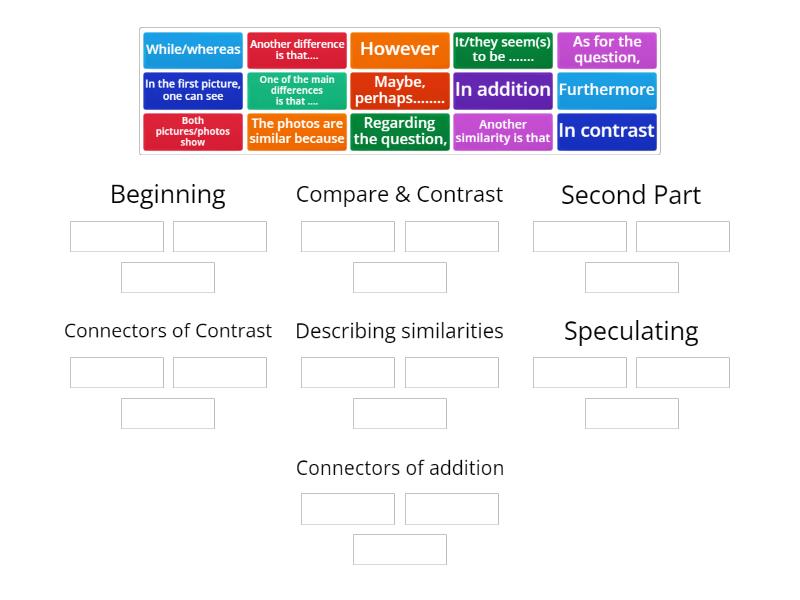 Beginning: Both pictures/photos show, In the first picture, one can see, Compare & Contrast: One of the main differences is that ...., Another difference is that...., Second Part: Regarding the question,, As for the question, , Connectors of Contrast: While/whereas, However, In contrast, Describing similarities: The photos are similar because, Another similarity is that, Speculating: Maybe, perhaps........, It/they seem(s) to be ......., Connectors of addition: In addition, Furthermore,