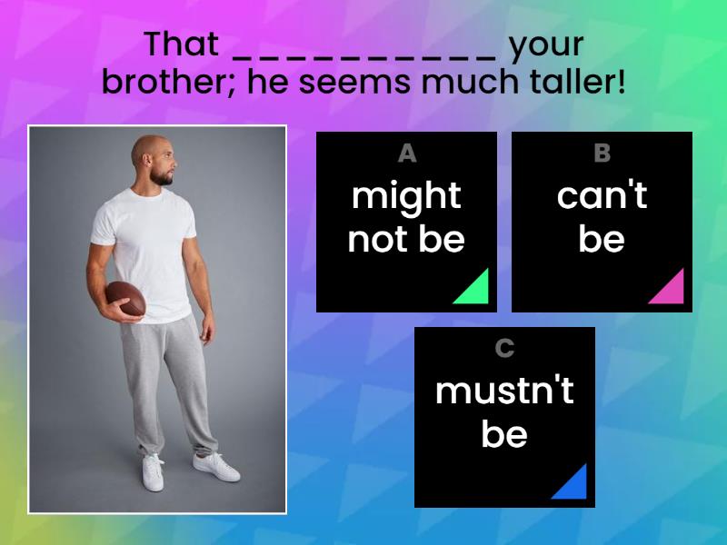 1) That __________ your brother; he seems much taller! a) might not be b) can't be c) mustn't be 2) You shattered the window, so you __________ for it now.  a) should pay b) might pay c) mustn't pay 3) __________ we use tomato instead of peppers? I don't like them. a) will b) may c) could 4) I _________ able to help you but it depends on your cooperation. a) can be b) might be c) would be 5) I have been waiting for you all day; you ________ me you wouldn't come home until night! a) would have told b) could have told c) may have told 6) The party _________ terrible, as you left so soon! a) must have been b) may have been c) could have been 7) He __________ on holidays; I saw him working a minute ago! a) may not have gone b) can't have gone c) couldn't have gone 8) I __________ get lettuce for the salad so I used arugula instead. a) couldn't b) might not c) wasn't able to 9) I'm sorry I'm working now, but I __________ help you this afternoon when I've finished.  a) should can b) should to c) should be able to 10) You _________ any more food; I brought some and Nancy brought some too... Now there's too much! a) didn't need to bring b) needn't have brought c) didn't have to bring