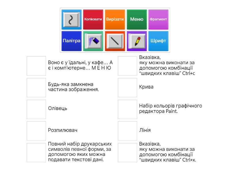 Розпилювач , Крива, Меню - Воно є у їдальні, у кафе… А є і комп'ютерне… М Е Н Ю, Вирізати - Вказівка, яку можна виконати за допомогою комбінації “швидких клавіш” Ctrl+x., Фрагмент - Будь-яка замкнена частина зображення., Лінія, Шрифт - Повний набір друкарських символів певної форми, за допомогою яких можна подавати текстові дані., Копіювати - Вказівка, яку можна виконати за допомогою комбінації “швидких клавіш” Ctrl+c, Олівець, Палітра - Набір кольорів графічного редактора Paint.,