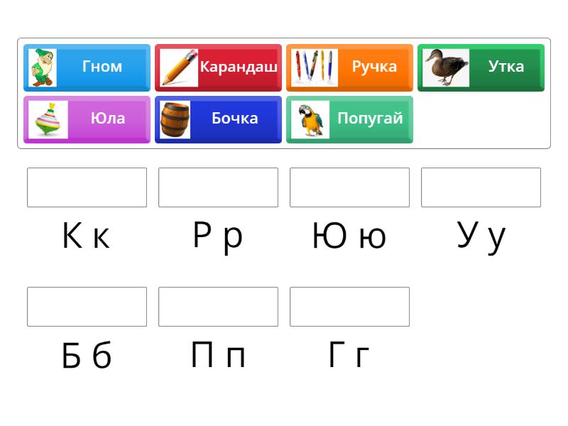 Бочка - Б б, Гном - Г г, Карандаш - К к, Попугай - П п, Ручка - Р р, Утка - У у, Юла - Ю ю,