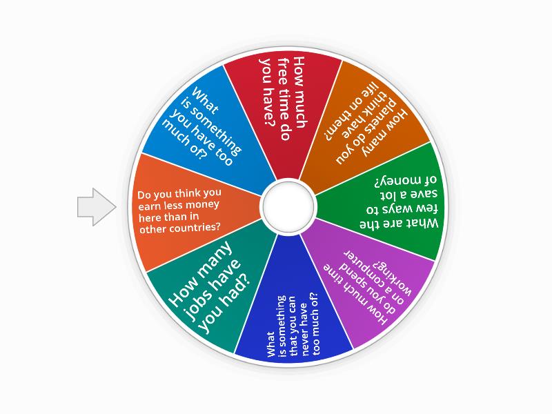 What is something you have too much of?, How much free time do you have?, How many planets do you think have life on them?, What are the few ways to save a lot of money?, How much time do you spend on a computer working?, What is something that you can never have too much of?, How many jobs have you had?, Do you think you earn less money here than in other countries?.