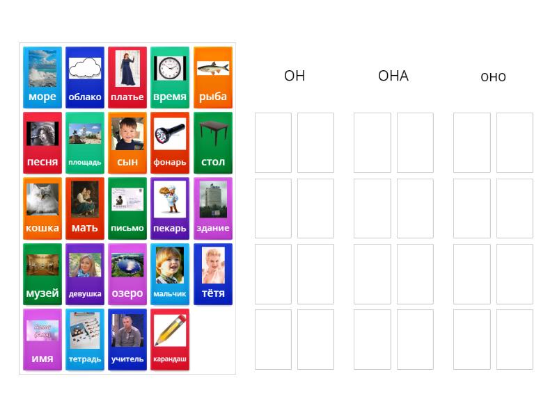 ОН: стол, фонарь, мальчик, учитель, сын, музей, карандаш, пекарь, ОНА: кошка, мать, тётя, девушка, песня, тетрадь, рыба, площадь, оно: письмо, здание, облако, время, море, озеро, имя, платье,