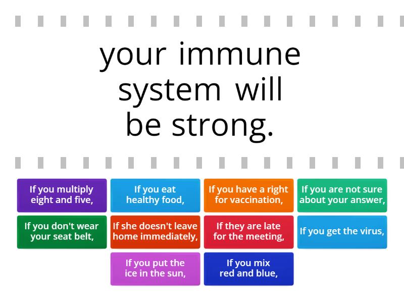 If you eat healthy food, - your immune system will be strong., If they are late for the meeting, - we may postpone it., If you have a right for vaccination, - you should get an appointment from your doctor., If you don't wear your seat belt, - you can be injured during a crash., If you put the ice in the sun, - it melts., If you mix red and blue, - you get purple., If you are not sure about your answer, - you had better not circle it., If she doesn't leave home immediately, - she may be late for the bus, If you multiply eight and five, - you get forty., If you get the virus, - you can infect your family members,too.,