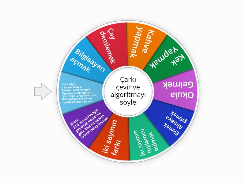 Bilgisayarı açmak, Çay demlemek, Kahve yapmak, Kek Yapmak, Okula Gelmek, Ekmek Almaya gitmek, İki sayının toplamını bulmak, iki sayının farkı, Kilosu 30 tl alınan Fındığın girilen kg miktarına göre ödenen toplam tutarın hesaplanması, Virüs Salgını Sırasında  Hastalık Belirtileri Gösteren Kişinin Uygulayabileceği Algoritma Virüs Salgını Sırasında Hastalık Belirtileri Gösteren Kişinin Uygulayabileceği Algoritma .