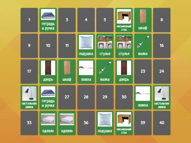 стулья, письменный стол, шкаф, настольная лампа, дверь, ложка, вилка, тетрадь и ручка, подушка, одеяло, кровать, фен, часы, чайник, гитара, чашка, книги, зеркало, цветок в горшке, шахматы,