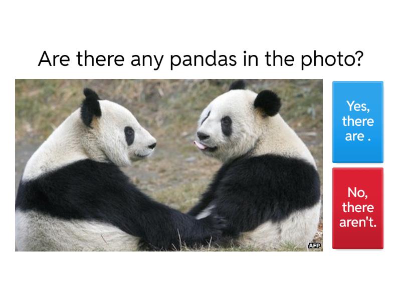 1) Are there any pandas in the photo? a) Yes, there are . b) No, there aren't. 2) Are there any bees in the photo? a) Yes, there ARE. b) No, there AREN'T. 3) Are there any rhinos in the photo? a) Yes, there ARE. b) No, there AREN'T. 4) There aren't ANY gorillas in the photo. a) TRUE b) FALSE. 5) There are SOME tigers in the photo. a) TRUE b) FALSE