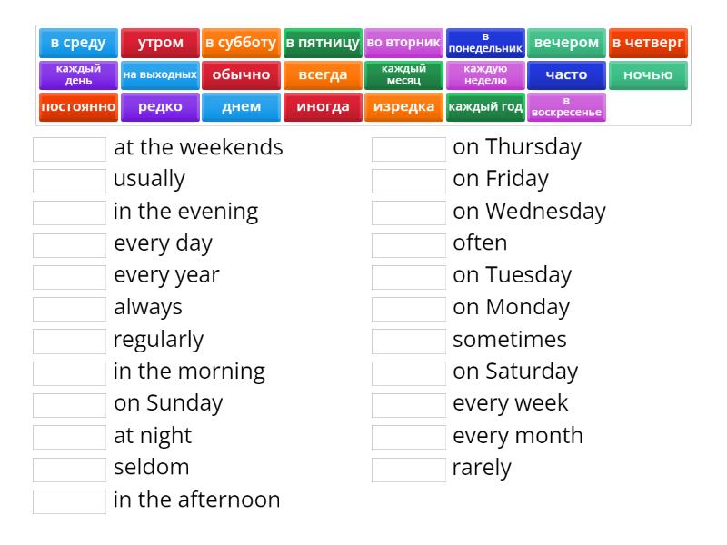 обычно - usually, постоянно - regularly, часто - often, всегда - always, изредка - seldom, иногда - sometimes, редко - rarely, каждый день - every day, каждую неделю - every week, каждый месяц - every month, каждый год - every year, утром - in the morning, днем - in the afternoon, вечером - in the evening, ночью - at night, на выходных - at the weekends, в понедельник - on Monday, во вторник - on Tuesday, в среду - on Wednesday, в четверг - on Thursday, в пятницу - on Friday, в субботу - on Saturday, в воскресенье - on Sunday,