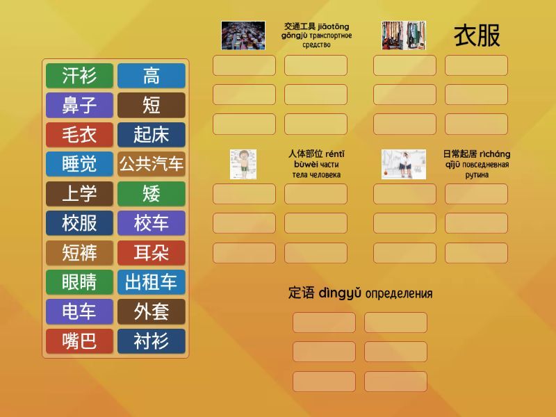 交通工具 jiāotōng gōngjù транспортное средство: 校车, 出租车, 公共汽车, 电车, 衣服: 衬衫, 短裤, 毛衣, 校服, 汗衫, 外套, 人体部位 réntǐ bùwèi части тела человека : 眼睛, 鼻子, 耳朵, 嘴巴, 日常起居 rìcháng qǐjū повседневная рутина : 睡觉, 上学, 起床, 定语 dìngyǔ определения: 高, 矮, 短,