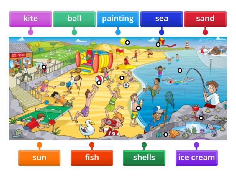 painting, sand, sun, shells, kite, sea, ball, fish, ice cream.
