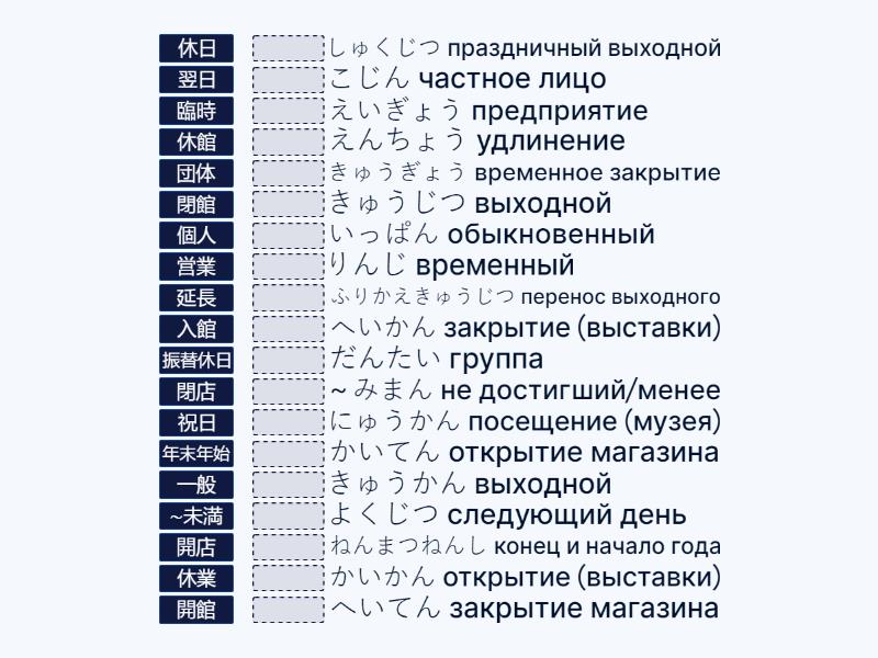 開館 - かいかん открытие (выставки), 閉館 - へいかん закрытие (выставки), 休館 - きゅうかん выходной, 入館 - にゅうかん посещение (музея), 営業 - えいぎょう предприятие, 休業 - きゅうぎょう временное закрытие, 開店 - かいてん открытие магазина, 閉店 - へいてん закрытие магазина, 延長 - えんちょう удлинение, 臨時 - りんじ временный, 年末年始 - ねんまつねんし конец и начало года, 祝日 - しゅくじつ праздничный выходной, 振替休日 - ふりかえきゅうじつ перенос выходного, 休日 - きゅうじつ выходной, 翌日 - よくじつ следующий день, 個人 - こじん частное лицо, 団体 - だんたい группа, 一般 - いっぱん обыкновенный, ∼未満 - ~みまん не достигший/менее,