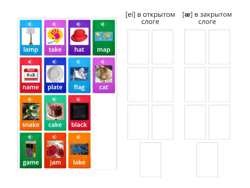 [ei] в открытом слоге: name, game, lake, cake, plate, take, snake, [ᴂ] в закрытом слоге: black, jam, lamp, flag, hat, cat, map,