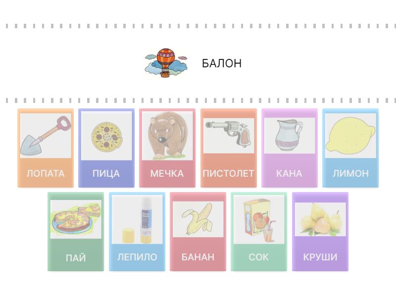 ЛИМОН - БАЛОН, БАНАН - ДИВАН, ЛОПАТА - САЛАТА, ПАЙ - ЧАЙ, КАНА - ВАНА, ПИЦА - ПТИЦА, СОК - БЛОК, ПИСТОЛЕТ - САМОЛЕТ, КРУШИ - БОТУШИ, ЛЕПИЛО - ХВЪРЧИЛО, МЕЧКА - ПЕЧКА,