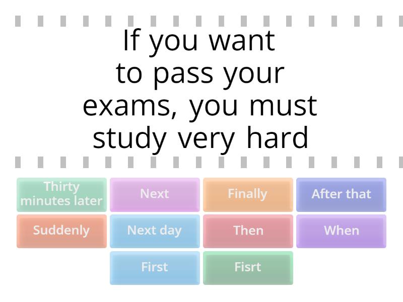 First - If you want to pass your exams, you must study very hard, Then - David woke up late and ____ he was late for work., Finally - Michael ____ finished the project last week., Fisrt - When you cook vegetables, you should wash them ____, Next - Tom and Sarah travel a lot. They don't know where to go ____ ., After that - Their meeting started at . ________ they went to a restaurant., Thirty minutes later - We went to bed, __________ the phone rang., Suddenly - I was going to school, __________ a cat crossed in front of me., When - My parents were sleeping ________ I arrived at home., Next day - My cousin went to a party last Friday. __________ he didn't remeber anything.,