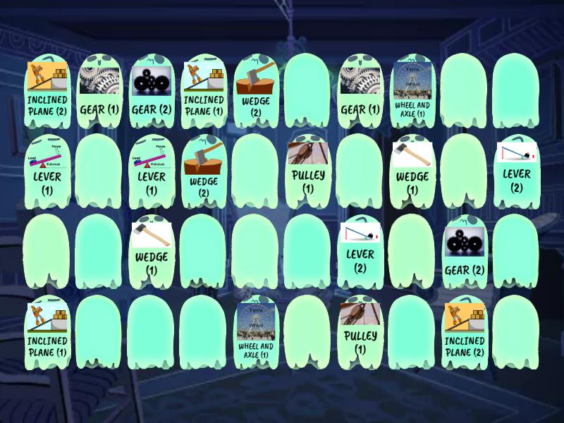 WEDGE (1), WEDGE (2), INCLINED PLANE (1), INCLINED PLANE (2), GEAR (1), WHEEL AND AXLE (1), LEVER (1), LEVER (2), PULLEY (1), GEAR (2), WHEEL AND AXLE (2), SCREW (1), SCREW (2), WEDGE (3), PULLEY (2), INCLINED PLANE (3), WHEEL AND AXLE (3), GEAR (3), LEVER (3), SCREW (3),
