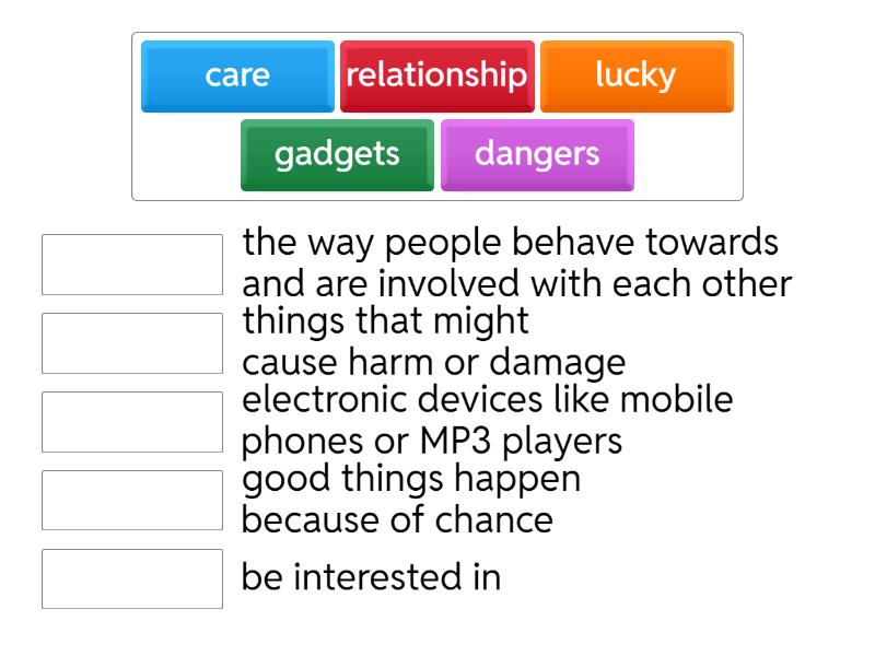care - be interested in, gadgets - electronic devices like mobile phones or MP3 players, lucky - good things happen because of chance, dangers - things that might cause harm or damage, relationship - the way people behave towards and are involved with each other,