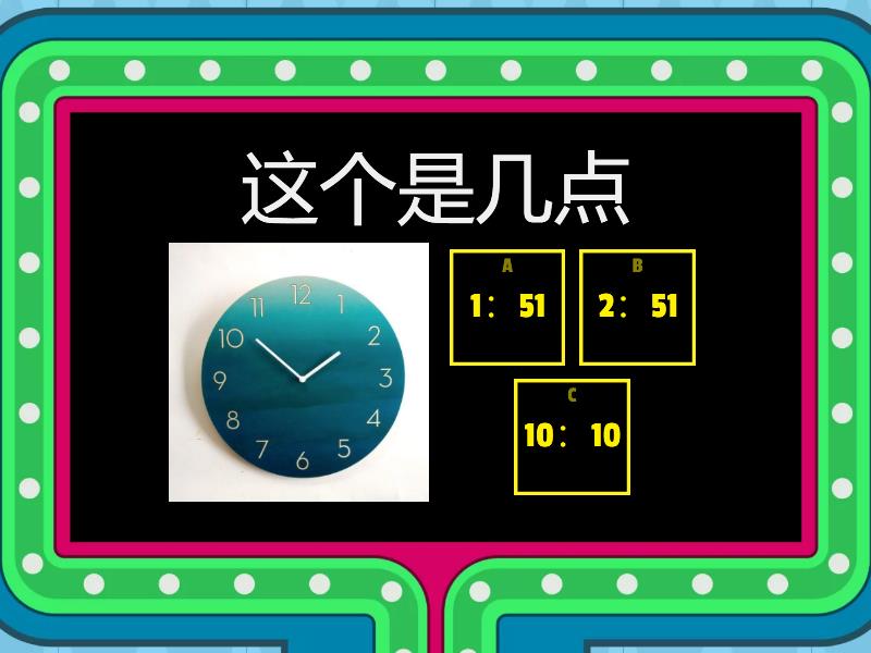 1) 1个小时有多少分钟 a) 60分钟 b) 44分钟 c) 30分钟 2) 1分钟有多少秒 a) 230秒 b) 10秒 c) 60秒 3) 这个是几点 a) 10:2 b) 10:10 c) 9:10 4) 这个是几点 a) 1:51 b) 2:51 c) 10:10 5) 100分钟+1小时= a) 2小时40分钟 b) 2小时30分钟 c) 3小时40分钟 6) 5小时30分钟-1小时50分钟= a) 3小时40分钟 b) 4小时20分钟 c) 3小时40分钟 7) 30分钟+1小时50分钟= a) 2小时20分钟 b) 1小时20分钟 c) 1小时80分钟 8) 1分钟30秒+2分钟40秒=多少秒 a) 250秒 b) 240秒 c) 249秒