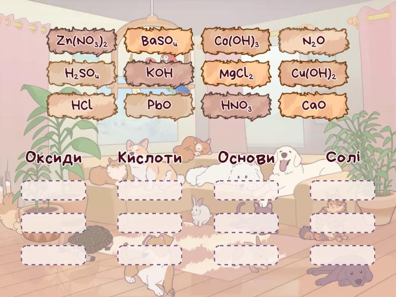 Оксиди: N2O, CaO, PbO, Кислоти: HNO3, HCl, H2SO4, Основи: KOH, Co(OH)3, Cu(OH)2, Солі: Zn(NO3)2, MgCl2, BaSO4,