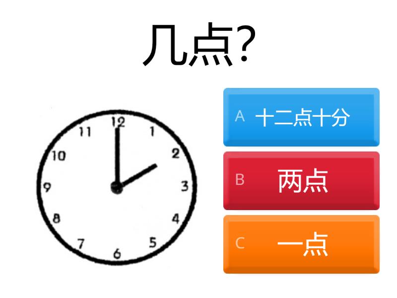 1) 几点?  a) 十二点十分 b) 两点 c) 一点 2) 几点? a) 一点一刻 b) 三点 c) 三点零líng 五分 3) 几点? a) 五点半 b) 九点二十五分 c) 差一刻五点 4) 几点? a) 六点 b) 十二点 c) 十八点 5) 几点? a) 六点十分 b) 一点半 c) 两点半 6) 几点? a) 一点 b) 七点 c) 七点零líng五分 7) 几点? a) 十二点零五分 b) 十二点 c) 一点 8) 几点? a) 十二点二十分 b) 四点 c) 一点十五分 9) 几点? a) 两点令五分 b) 一点十分 c) 十二点十分