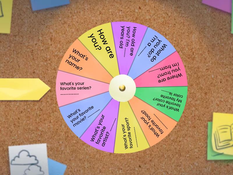 1) What's your name? 2) How are you? 3) How old are you? I'm ........ years old 4) What do you do? I'm a .......... 5) Where are you from? I'm from.......... 6) What's your favorite color? My favorite color is......... 7) What's your favorite food? ................... 8) What's your favorite sport? .................... 9) What's your favorite artist? ............ 10) What's your favorite movie? .............. 11) What's your favorite series? ...................