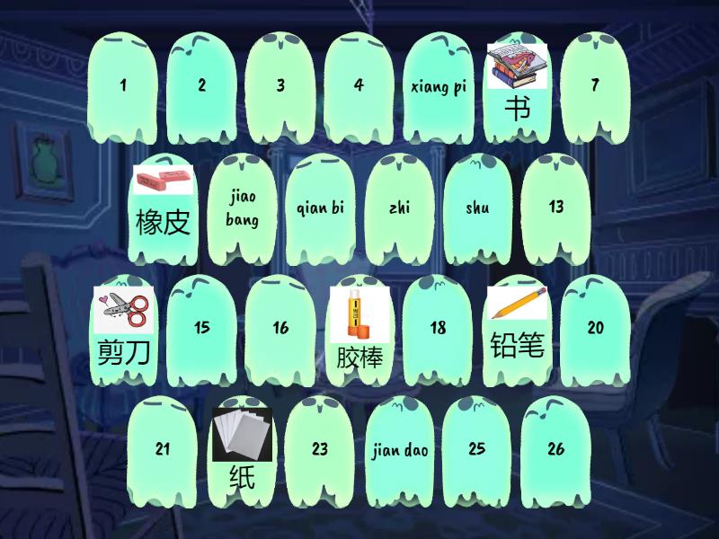 zhi - 纸, shu - 书, qian bi - 铅笔, xiang pi - 橡皮, jiao bang - 胶棒, jian dao - 剪刀, shu bao - 书包, la bi - 蜡笔, ben zi - 本子, ma ke bi - 马克笔, shui bei - 水杯, chi zi - 尺子, jiao shui - 胶水,