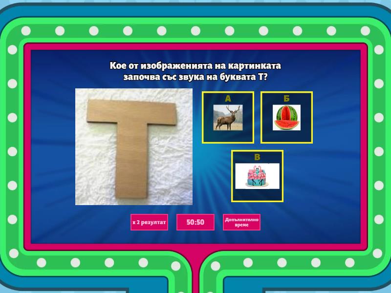 1) Кое от изображенията на картинката започва със звука на буквата Т? a) b) c) 2) Кое от изображенията на картинката започва със звука на буквата Т? a) b) c) 3) Кое от изображенията на картинката започва със звука на буквата Т? a) b) c) 4) Кое от изображенията на картинката започва със звука на буквата Т? a) b) c) 5) Кое от изображенията на картинката започва със звука на буквата Т? a) b) c)