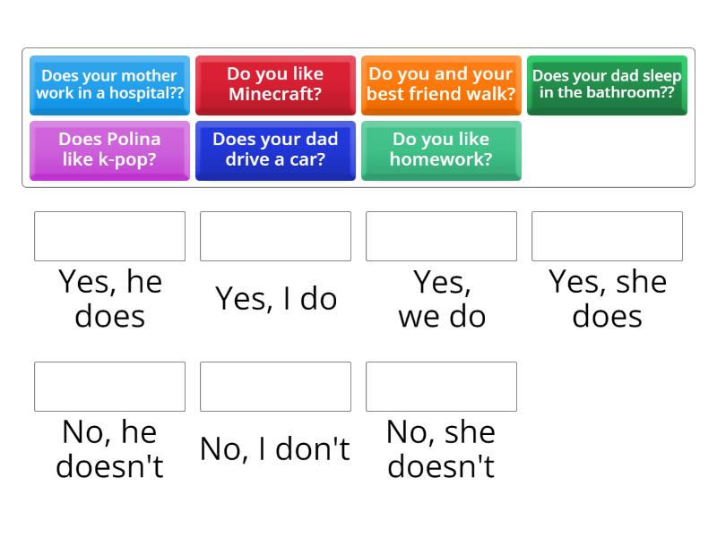 Do you like homework? - No, I don't, Does Polina like k-pop?  - Yes, she does, Does your mother work in a hospital?? - No, she doesn't, Do you and your best friend walk? - Yes, we do, Does your dad drive a car? - Yes, he does, Do you like Minecraft? - Yes, I do, Does your dad sleep in the bathroom?? - No, he doesn't,