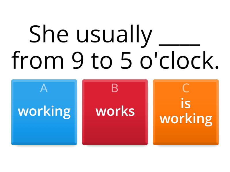 1) She usually ____ from 9 to 5 o'clock. a) working b) works c) is working 2) ___ Ann play tennis? a) Do b) Is c) Does 3) She ______ talk very much. a) isn't b) don't c) doesn't 4) I_______ TV at the moment. a) wathcing b) watches c) 'm watching 5) My parents ________ dinner now. a) have b) has c) 're having 6) My friend ________ two languages - Spanish and French. a) speak b) speaks c) speaking 7) We are on holiday now and________ in a beautiful hotel! a) staying b) stay c) stays 8) I can't speak now, I __________the car. a) drive b) am driving c) driving 9) I hardly ever ________ things from the internet. a) buy b) 'm buying c) buys 10) We sometimes ________ movies at the cinema. a) watching b) are watching c) watch 11) _____ you like eating out? a) Are b) Do c) Does 12) I _______ like bowling. a) 'm not b) don't c) aren't 13) What ___ she usually wear? a) does b) do c) is 14) When ____your birthday? a) are b) is c) am 15) Where ____ you live? a) are b) does c) do 16) - Hi! What _____you_____now? a) are / doing? b) is / doing c) do / do? 17) I usually_____to the gym three times a week a) 'm going b) goes c) go 18) What's wrong? Why _____ you________? a) do / cry b) does / crying c) are / crying? 19) I usually _____ on holiday in summer. a) go b) gone c) going 20) Where is Nina? What _____ she ______? a) does / do b) is / do c) is /doing 21) I always _______ Christmas with my family. a) celebrating b) celebrate c) celebrates 22) She_______ working for the company. a) don't likes b) isn't liking c) doesn't like 23) We _________meetings every Monday. a) have b) are having c) having 24) What ______usually you _______ at weekends? a) do / doing b) do/do c) are / doing 25) I ________ my friends not very often a) meeting b) meets c) meet 26) I _______ waiting! a) hate b) 'm hating c) hates 27) He _________ getting the Tube, he usually walks. a) isn't liking b) doesn't like c) doesn't likes 28) How often ____your parents ______ you? a) does / visit b) are /visiting c) do / visit 29) I rarely ______a bus. a) is taking b) take c) am taking 30) Where _____you_______now? a) are / going b) do / go c) are / go
