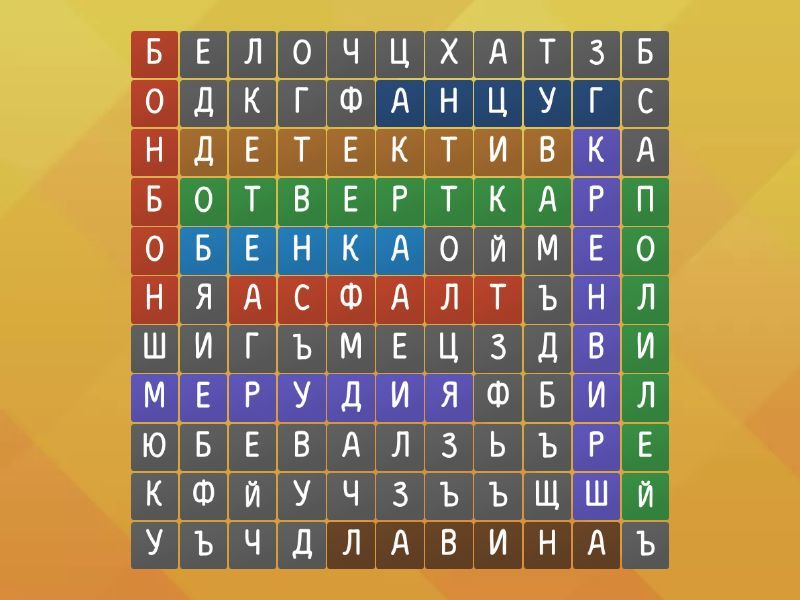 отвертка, мерудия, асфалт, бенка, лавина, анцуг, детектив, полилей, кренвирш, бонбон,