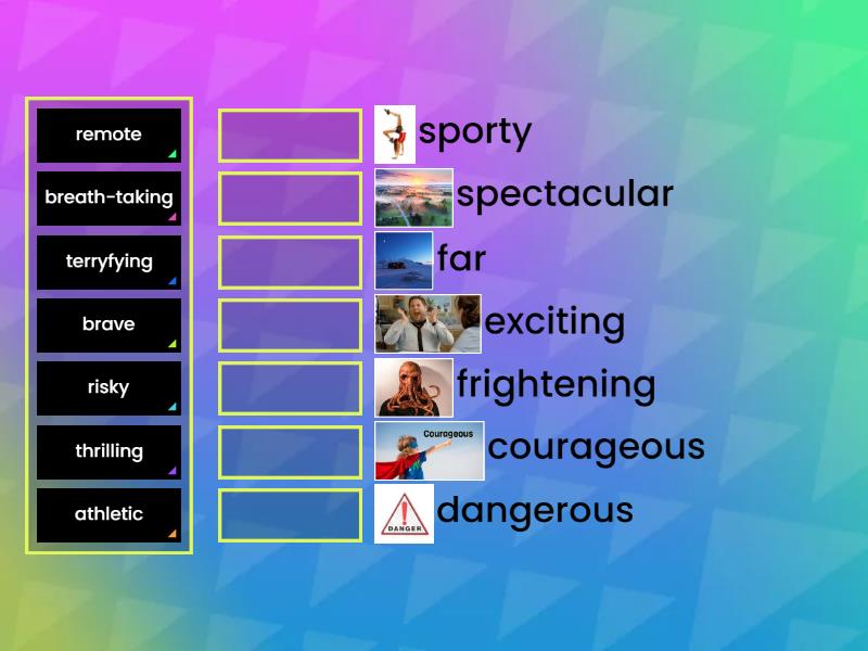 brave - courageous, athletic - sporty, risky - dangerous, breath-taking - spectacular, thrilling - exciting, terryfying - frightening, remote - far,