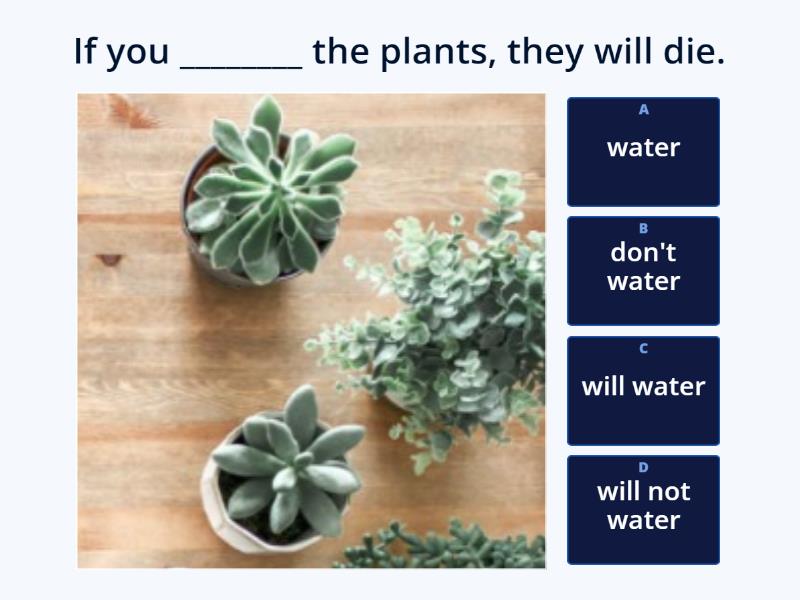 1) If you ________ the plants, they will die.  a) water b) don't water c) will water d) will not water 2) If she comes late, she _______ be fired.  a) will b) is c) was d) would 3) If we _________ on holiday this summer, we will go to Italy. a) will go b) go c) went d) would go 4) They _______ to the party if they are invited.  a) came b) will come c) would come d) will have come 5) She will stay in London if she _______ that job. a) get b) gets c) will get d) got 6) I _______ dinner if you go to the market and buy the vegetables. a) cook b) would cook c) cooked d) will cook 7) She will take a taxi if it _______. a) rain b) rains c) willl rain d) would rain 8) If you _______ me your number, I will call you. a) give b) will give c) gave d) would give