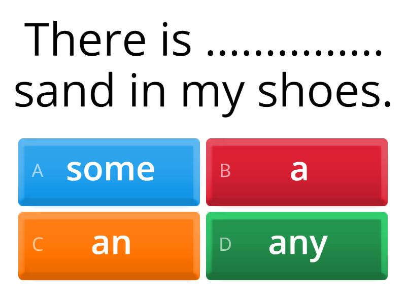 1) Are there _________ sandwiches on the table? a) some b) any c) a d) an 2) Have you got ________ apple in your bag? a) a b) any c) an d) some 3) There is _________ sugar in my tea. a) a b) some c) any d) an 4) There is _________ sand on the beach. a) some b) any c) a d) an 5) There isn't _________ coffee in the cup. a) a b) any c) some d) an 6) We don't need ____________ bananas. a) any b) a c) some d) an 7) I need_________ rice and ______ onion. a) a / some b) a / an c) some / an d) some / any 8) My mum doesn´t drink ___________ tea for breakfast. a) a b) any c) some d) an 9) Robert often drinks ______ milk. a) some b) a c) any d) an 10) Is there ________ carrot in the soup? a) any b) a c) some d) an 11) Do you have __________ orange juice? a) an b) any c) some d) a 12) We need __________ apple for the cake. a) a b) any c) some d) an 13) Have you got __________ egg? a) any b) some c) an d) a 14) Is there _________ snow on the mountain? a) a b) some c) any d) an 15) Do you want ________ cheeseburger? a) a b) any c) some d) an 16) Buy ______________ sweets, please! a) some b) a c) an d) any 17) There is ___________ snow on the top of the mountain. a) a b) an c) some d) any 18) Are there ____________ books in the book case? a) a b) an c) some d) any 19) There are …………… exercise books on the floor. a) a b) an c) some d) any 20) Have you got ……………brother? a) a b) an c) some d) any 21) I can´t see …………… snow. a) a b) an c) some d) any 22) There is ............... sand in my shoes. a) a b) an c) some d) any 23) There are ............... rivers in the countryside. a) a b) an c) some d) any 24) There aren´t ……………beautiful flowers in the garden. a) a b) an c) some d) any 25) They don´t sing……………songs. a) a b) an c) some d) any 26) We are waiting for…………… minutes. a) a b) an c) some d) any 27) I don´t want …………… ketchup. a) a b) an c) some d) any 28) Can you see ........ lake? a) a b) an c) some d) any 29) There aren´t .............. waves on the sea. a) a b) an c) some d) any 30) There is only ............. ice on the top of the mountain. a) a b) an c) some d) any