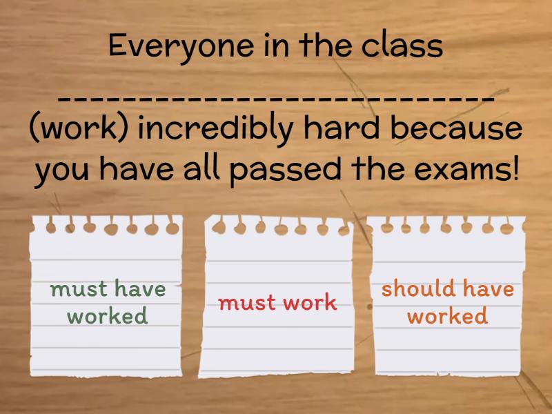 1) Everyone in the class ___________________________ (work) incredibly hard because you have all passed the exams!  a) must have worked b) must work c) should have worked 2) I don't know how old the teacher is, but he looks quite young, so he _______________ (be) more than 25.  a) might be b) must be c) can't be 3) They say it _______________ (rain) at the weekend, so we won't be able to play football on Saturday. a) should rain b) might rain c) must rain 4) You shouldn't have jumped off the wall! You were lucky, but you ______________ (break) your leg. a) could have broken b) can break c) could broken 5) Although the shop was very crowded, we _____________ (get) the shopping done quickly. a) were able to get b) could get c) can get 6) When I was a kid, I ____________ (sing) really beautifully, but my voice isn't so good now. a) could to sing b) was able to sing c) could sing