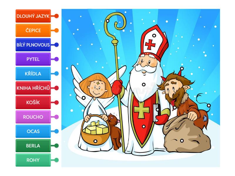 KŘÍDLA, KOŠÍK, ČEPICE, BERLA, ROUCHO, BÍLÝ PLNOVOUS, ROHY, DLOUHÝ JAZYK, PYTEL, OCAS, KNIHA HŘÍCHŮ.