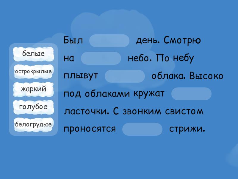 Был ____ день. Смотрю на ____ небо. По небу плывут ____ облака. Высоко под облаками кружат ____ ласточки. С звонким свистом проносятся ____ стрижи. ____ — это наименьшая единица общения. Оно характеризуется интонацией ____, которая на письме передаётся ____, вопросительным или ____ знаком. Слова в предложении связаны ____, т. е. с помощью окончаний и предлогов, а также по ____. Предложение имеет грамматическую ____, которая состоит из главных членов — ____ и сказуемого или одного из них.