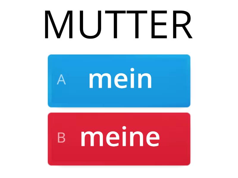 1) MUTTER a) mein b) meine 2) VATER a) mein b) meine 3) OMA a) meine b) mein 4) OPA a) meine b) mein 5) BRUDER a) mein b) meine 6) SCHWESTER a) meine b) mein 7) KATZE a) mein b) meine 8) HUND a) mein b) meine 9) Großvater a) mein b) meine 10) Großmutter a) meine b) mein 11) Kind a) mein b) meine 12) Eltern a) meine b) mein 13) Geschwister a) meine b) mein 14) Tochter a) meine b) mein 15) Sohn a) mein b) meine