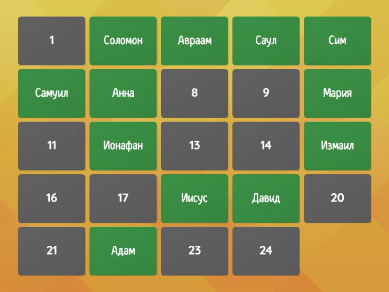 Саул - Ионафан, Давид - Соломон, Анна - Самуил, Мария - Иисус, Адам - Сим, Авраам - Измаил, Иов - Керенгаппух, Лаван - Рахиль, Ревекка - Иаков, Амрам - Аарон, Евника - Тимовей, Иоанн - Зеведей,