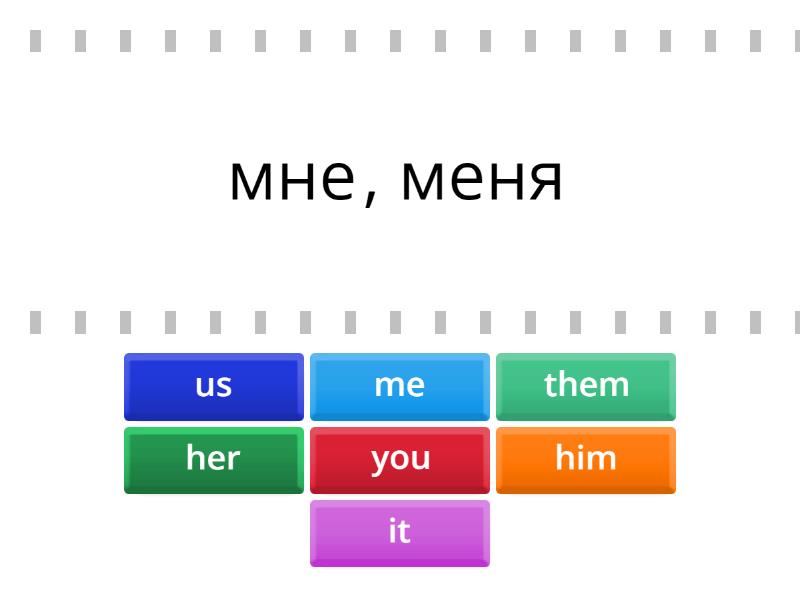 me - мне, меня, you - тебя, вас, him - ему, его, her - ее, ей, it - ему, его, ей, ее, us - нам, нас, them - им, их,