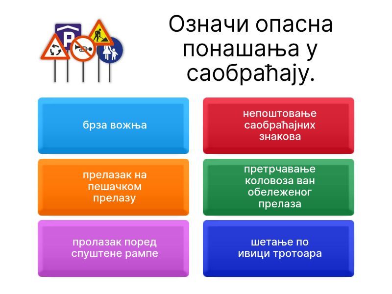 1) Превозна средства служе за превоз људи и робе. a) тачно b) нетачно 2) Означи врсте саобраћаја. a) копнени b) земљани c) водени d) ваздушни e) небески f) сеоски 3) Која превозна средства спадају у копнени саобраћај? a) чамац b) бицикл c) аутомобил d) авион e) трактор f) камион 4) Површина намењена за кретање пешака зове се... a) коловоз b) тротоар c) писта 5) Пешачки прелаз се другачије назива... a) жирафа b) камила c) зебра 6) Површина намењена за кретање возила назива се... a) подземни пролаз b) коловоз c) тротоар 7) Када идемо путем без тротоара морамо се кретати: a) средином пута b) левом страном пута c) десном страном пута 8) Која врста саобраћаја је најјефтинија? a) водени b) копнени c) ваздушни 9) Која превозна средства се крећу по шинама? a) воз b) хеликоптер c) трамвај d) мотор 10) За слетање и полетање авиона служи: a) писта b) пристаниште c) станица 11) Која превозна средства спадају у ваздушни саобраћај? a) хеликоптер b) јахта c) авион d) ракета e) цепелин f) тротинет 12) Распоред боја на семафору је: a) црвено, жуто, зелено b) зелено, жуто, црвено c) жуто, црвено, зелено 13) Да ли је безбедно играти се на коловозу? a) Да, јесте. b) Не, веома је опасно. 14) Означи опасна понашања у саобраћају. a) брза вожња b) непоштовање саобраћајних знакова c) прелазак на пешачком прелазу d) претрчавање коловоза ван обележеног прелаза e) пролазак поред спуштене рампе f) шетање по ивици тротоара 15) Означи правилно понашање у саобраћају. a) гурати се при уласку у аутобус b) поштовати ограничење брзине c) прелазити улицу са слушалицама у ушима d) пре преласка улице погледати лево и десно e) говорити тихо у јавном превозу f) бацати смеће по јавном превозу