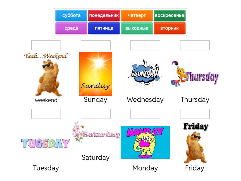 понедельник - Monday, суббота - Saturday, четверг - Thursday, вторник - Tuesday, воскресенье - Sunday, пятница - Friday, среда - Wednesday, выходные - weekend,