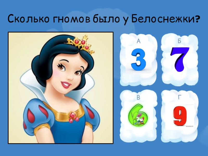1) Сколько гномов было у Белоснежки? a) b) c) d) 2) Как звали девочку которая побывала в стране чудес a) Женя b) Маша c) Алиса d) Василиса 3) Как зовут Королевича из сказки А.С. Пушкина? a) Салтан b) Евсей c) Алексей d) Елисей 4) Как звали птицу , несущую золотые яйца a) Клаша b) Дональд Дак c) Ряба d) Несушка 5) Как звали девочку , которая превратилась в облачко? a) Снежинка b) Снежка c) Снегурочка d) Снежаннна 6) Кто скушал страшного тараканища ? a) снегирь b) ласточка c) ворона d) воробей 7) Что лишнее? a) золотой ключик b) пиявки c) театр d) туфелька e) черепаха 8) Кто лишний ? a) Таня b) Зайка c) Кот d) Бычок e) Ласточка 9) Сказочное, поющее хлебобулочное изделие a) Мякиш b) Калач c) Колобок d) Пирожок 10) Сколько братьев подарили девочке корзину с подснежниками a) 10 b) 7 c) 3 d) 12 11) Угадай сказку? " Снег, ворон, зеркало, роза, дружба" a) Снежная королева b) Ворона и лиса c) Королевство кривых зеркал d) Принц и роза e) Маугли 12) ребус a) косить b) корень c) пеньки d) косточка 13) Торт разрезали на четыре одинаковые части , а потом каждую часть разрезали на две одинаковые части . На сколько человек хватит торта, если каждый возьмёт по куску. a) b) c) d)
